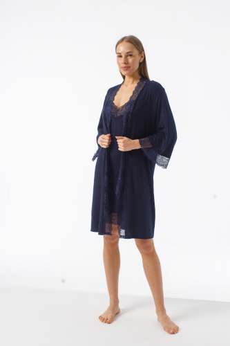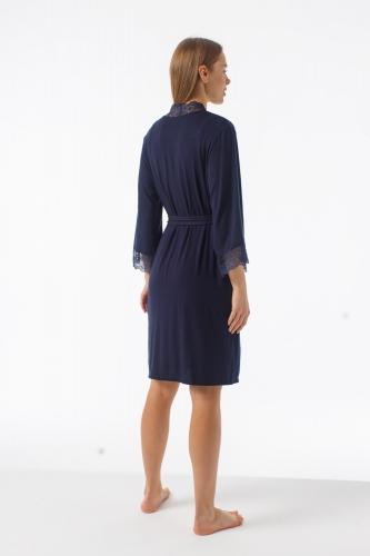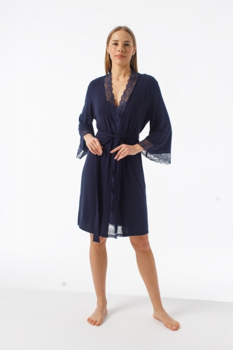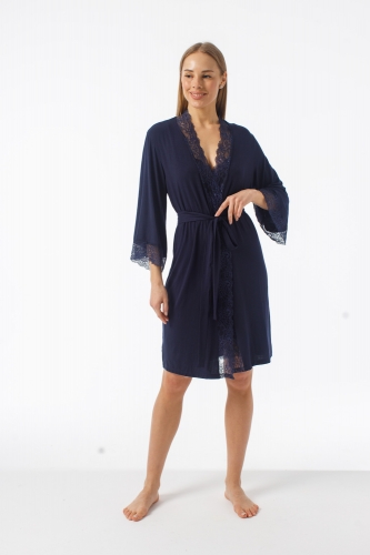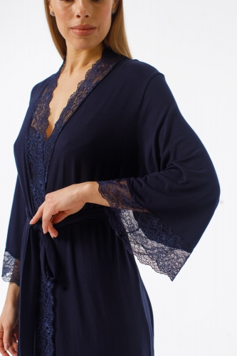 Пеньюар с запахом, прямого кроя, с рукавами 3/4, на поясе. Выполнен из микромодала, с отделкой кружевом по бортам и низу рукавов.