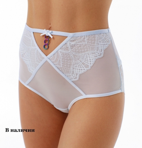 Трусы макси с высокой линией талии. Выполнены из эластичной сетки и эластичного кружева. Украшение: медальон в виде трёх колец.