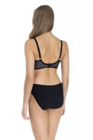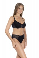Бюстгальтер с формованными чашками ”spacer” (монофил) на каркасах и стане. Стан из эластичного кружева на подкладке из эластичного сетчатого полотна. Бюстгальтер с увеличенной высотой бочка, чтобы лучше прикрыть подмышечную зону.
