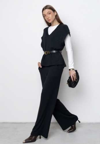 Вискоза 48%, ПА 19%, ПЭ 29%, Эластан 4%Брюки свободного силуэта с карманами по бокам и поясом на комфортной резинке. Модель миксуется с джемперами и жилетом данной коллекции, создавая новые образы на каждый день. Представлены в трех цветовых решениях.