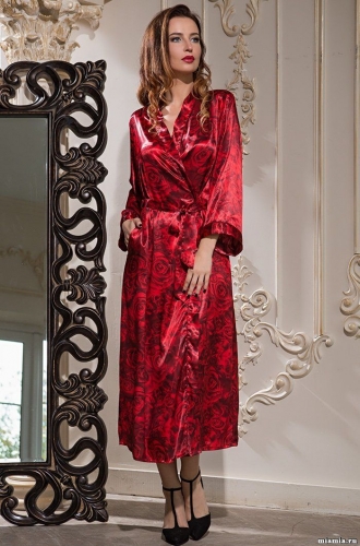 Длинный халат Mia-Amore из смесового шелкового полотна с ярким рисунком в виде роз, планка халата и рукава декорированы атласным кантом.