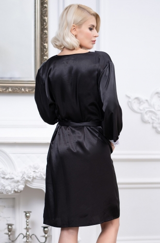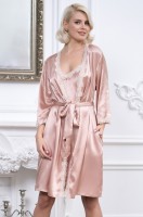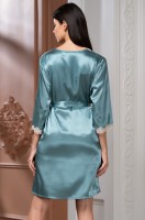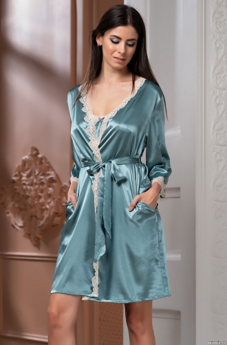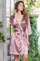 Короткий халат Mia-Mella с рукавами 3/4 выполнен из искусственного шелкового полотна с атласным блеском. Рукава и борта халата декорированы изящным кружевом. Халат на запахе с поясом, в боковых швах есть карманы. Состав: 100% полиэстер