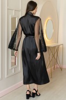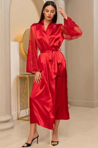 Длинный запашной халат Mia-Amore с длинными широкими рукавами выполнен из принтованного смесового шёлка. Широкие рукава халата выполнены из мягкой сетки и декорированы кружевными вставками. Халат комплектуется широким поясом, в боковых швах карманы. Состав: 70% натуральный шелк, 25% полиэстер, 5% эластан