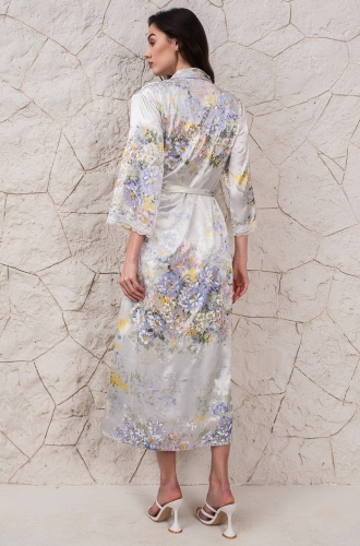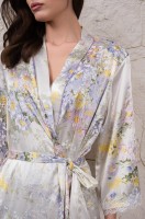 Короткий халат Mia-Amore выполнен из смесовой принтованной ткани. Ажурное кружево расположено по низу рукавов, борту и низу халата.