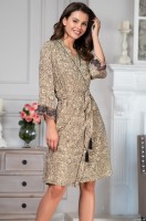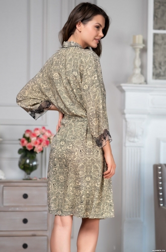 Короткий халат – кимоно Mia-Amore выполнен из тканной принтованной вискозы в сочетании с изысканным кружевом. Рукава ?, низ рукавов изящно декорирован роскошной вышивкой на тюле. Борта халата украшены тонкими кантами. В комплекте пояс с кисточками.