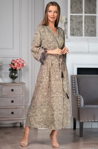 Элегантный длинный халат Mia-Amore выполнен из тканной принтованной вискозы в сочетании с изысканным кружевом. Низ длинных рукавов изящно декорирован роскошной вышивкой на тюле. Борта халата украшены тонкими черными кантами. В комплекте пояс с кисточками.