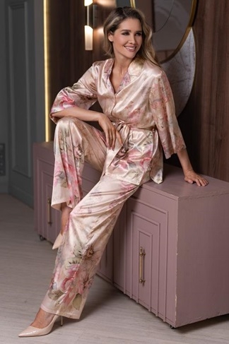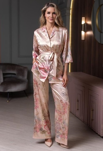 Комплект Mia-Amore выполнен из смесового принтованного шёлка. Комплект состоит широких брюк с карманами и жакета с центральной застежкой на пуговицы, который завязывается на талии съёмным поясом.