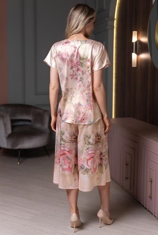 Комплект Mia-Amore выполнен из смесового притованного шёлка. Комплект состоит из блузки с короткими рукавами и декоративной застёжкой на пуговицы и широких укороченных брюк.