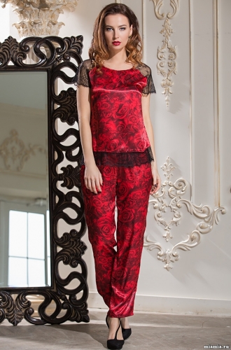 Комплект с брюками Mia-Amore выполнен из смесового шелкового полотна, рукава низ блузы декорированы ажурным черным кружевом.