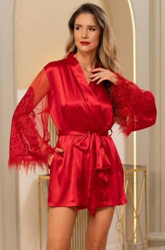 Комплект-тройка Mia-Amore состоит из топа, шорт и запашного удлинённого халата, выполнен из однотонного смесового шёлка. Спереди вырез топа декорирован узким кружевом и бантиком с подвеской, на спинке топа декоративная вставка из кружевного элемента. По бокам шорт высокие разрезы. Широкие рукава халата выполнены из мягкой сетки и декорированы кружевными вставками. Халат комплектуется широким поясом. Состав: 70% натуральный шелк, 25% полиэстер, 5% эластан