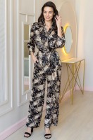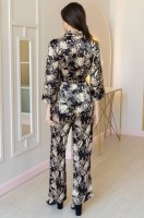 Комплект Mia-Amore состоит из рубашки с рукавами длиной 7/8, с центральной застежкой на пуговицы и брюк, выполнен из принтованного смесового шелка. Борт, воротник, рукава по низу украшены контрастным кантом. Рубашка запахивается на пояс с золотыми декоративными кисточками. Состав: 70% натуральный шелк, 25% полиэстер, 5% эластан