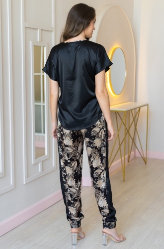 Комплект топ с брюками Mia-Amore выполнен из смесового шёлка. Верх принтованного топа со спущенными плечами выполнен из черного атласа, на полочке декоративный клапан с пуговкой. Принтованные брюки с поясом на резинке декорированы вертикальными контрастными лампасами, по низу штанины брюк собраны на манжет. Состав: 70% натуральный шелк, 25% полиэстер, 5% эластан
