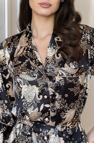 Рубашка до колен с центральной застежкой на пуговицы и с рукавами длиной 7/8 выполнена из принтованного смесового шёлка. Воротник и широкие манжеты декорированы контрастным кантом. На груди рубашки накладной кармашек. Рубашка комплектуется поясом с декоративными кисточками, в боковых швах есть карманы. Состав: 70% натуральный шелк, 25% полиэстер, 5% эластан
