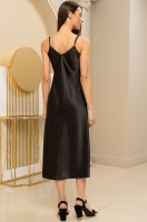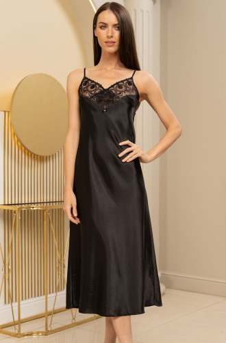 Длинная элегантная сорочка Mia-Amore на тонких бретелях, без подреза под грудью. Изделие выполнено из однотонного смесового шелка. Вышивное широкое кружево, дополненное черными кристаллами Swarovski, украшает вырез изделия. Декор - атласный бантик с подвеской, расположенный по центру выреза сорочки.