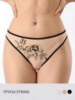 Трусы «стринги» из сетки с V - образным вырезом спереди и завышенной линией бедра. С изящной цветочной вышивкой и контрастной отделкой по краям. Соблазнительно подчеркивают бедра, практически полностью открывают ягодицы. Превосходно сочетаются с тонкой и облегающей одеждой.