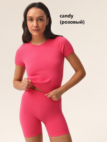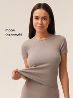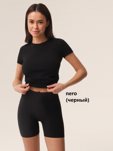 Базовая футболка с короткм рукавом и круглым вырезом из мягкой микрофибры с фактурой рубчик. Специальная бесшовная технология позволяет изделию идеально облегать тело, полуприлегающий силуэт подчеркивает фигуру. Вырез обработан мягкой бейкой для дополнительного комфорта.