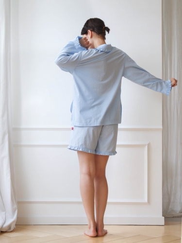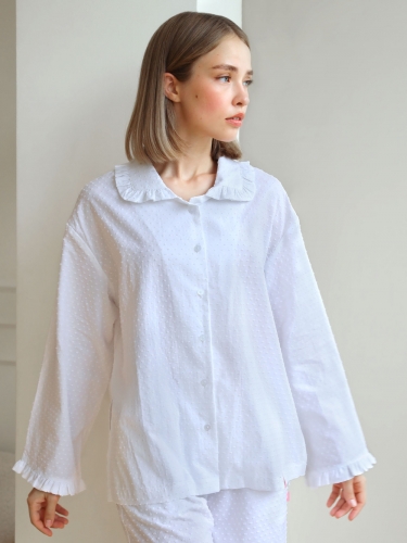 Домашяя женская рубашка оверсайз из легкого хлопкового фактурного батиста "Мушка". Легкая и воздушная рубашка прямого кроя с нежными рюшами на вороте и манжете придает образу невероятную нежность и чувственность. Рубашка прекрасно сочетается с шортами и брюками MY. Состав: 100% хлопок Обмеры изделия: Длина изделия по спинке: S/M — 71-72 см, L/XL — 74-75 см Длина изделия по переду: S/M — 66-67 см, L/XL — 68-69 см Ширина изделия под проймой (?): S/M — 56-57 см, L/XL — 61-62 см Ширина изделия по низу (?): S/M — 58-59 см, L/XL — 64-65 см Ширина рукава (?): S/M — 20-21 см, L/XL — 22-23 см Ширина горловины: S/M — 19 см, L/XL — 20 см Длина плеча: S/M — 20 см, L/XL — 21 см Длина рукава: S/M — 28-29 см, L/XL — 30-31 см Длина пояса: S/M — 200-201 см, L/XL —200-201 см Сделано в России.