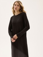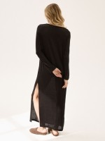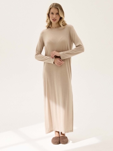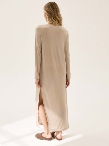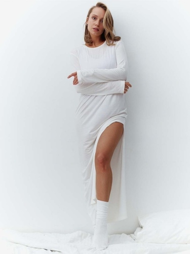 Домашнее платье из струящегося трикотажа. Свободный силуэт, длинный рукав, боковой разрез и мягкая, приятная к телу ткань подойдут для сна и расслабленного домашнего образа. Состав: 100% тенсель Обмеры изделия: Сделано в России.