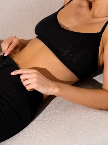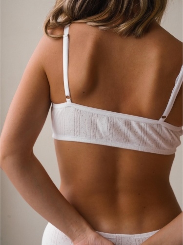 Топ женский на тонких регулируемых бретелях из хлопкового ажурного трикотажа. Регуляторы на бретелях позволяют корректировать посадку изделия. Бюстгальтер без подкладки и чашек-вкладышей. Состав: 100% хлопок