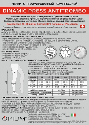 Антиэмболические чулки премиум класса. Матовые, комфортные, прочные. Укрепленная пятка, открывающийся мысок. Высококачественные материалы обеспечивают длительный срок использования.НАЗНАЧЕНИЕ:для улучшения кровообращения в ногах и профилактики тромбоэмболических осложнений в условиях стационара или длительного постельного режима.ПРЕИМУЩЕСТВА DINAMIC PRESS ANTITROMBO:- гарантия заявленного распределения градуированного по ноге давления,- возможность нанесения местных лекарственных средств снару