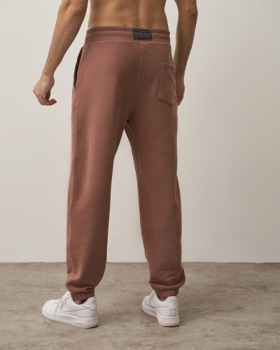 Джоггеры свободного кроя с цельнокроенным манжетом на резинке. Боковые карманы, пояс из двух частей, отстрочен. В пояс вдет шнурок с термоусадкой на концах пояса. Декор - вышивка.