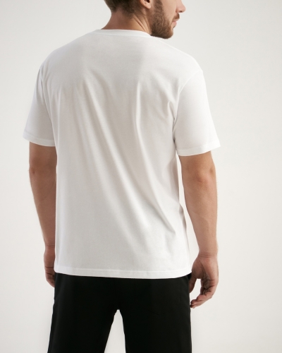 Футболка прямого фасона. Укрепление по горловине спинки. Горловина из рибаны, по переду горловины отстрочка.