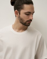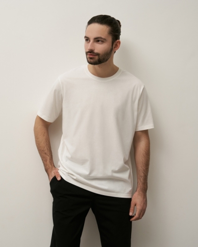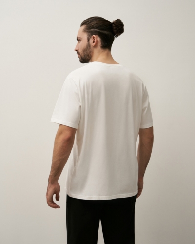 Футболка прямого силуэта. Укрепление бейкой плечевых швов и горловины спинки. Горловина из рибаны, по переду горловины отстрочка