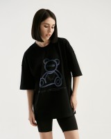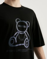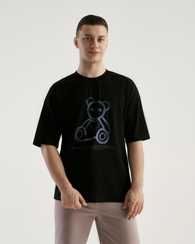 Футболка свободного силуэта. Горловина из рибаны. Текст принта: "But people who really know me, know that I am not a bad boy at heart... I am a big teddy bear." - "Но люди, которые меня действительно знают, знают, что в душе я неплохой мальчик ... Я большой плюшевый мишка."