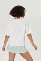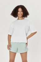 Укороченная футболка, спущенное плечо. Горловина рибана. Укрепление по горловине спинки и плечевым швам.