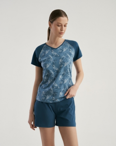 Футболка рукав реглан, по линии реглана, на полочке вставлен кант из отделочной ткани. Горловина и нижний срез рукава обработаны трикотажной лентой из однотонной ткани. Короткие шорты свободного кроя, отстроченный пояс.