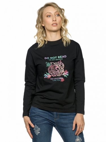 Новинка! Джемпер женский большого объема со спущенным плечом, горловиной из рибаны и стойким эластичным принтом в стиле неоновых красок. Перевод Не читай следующее предложение. Ах ты маленький проказник. Я люблю тебя.