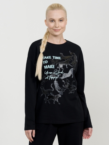 Лонгслив среднего объема. Крупный эластичный glossy принт на полутонах. Перевод Найдите время, чтобы сделать свою душу счастливой.