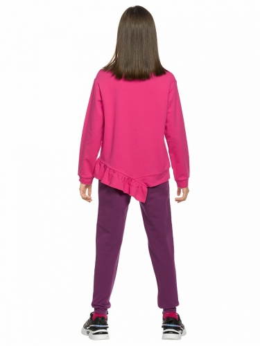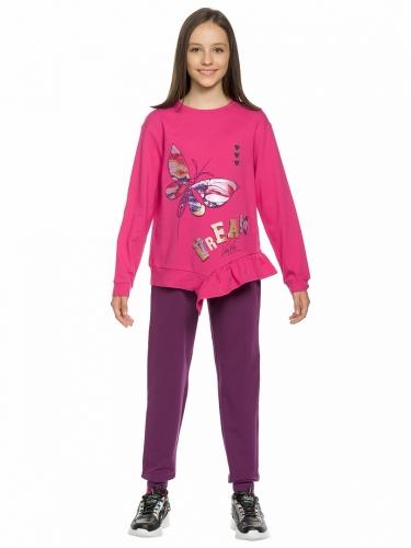 Маркированный товар Комплект из футера для девочек свитшот и брюки. Свитшот расслабленного силуэта. Rubber принт с золотым металликом и глиттером. Надпись Мечта. Вуаля. По низу изделия декоративный, асимметрично расположенный волан из основной ткани. Брюки на манжете из рибаны увеличенного, актуального объема без защипов. Пояс из основной ткани с эластиком внутри и дополнительной регулировкой объема шнурком.