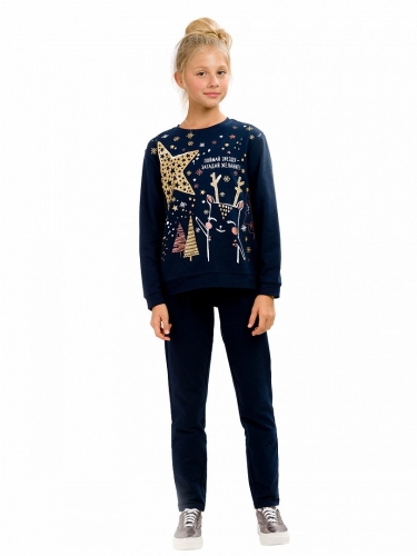 Маркированный товар Комплект для девочек: толстовка и брюки. Комплект из футера. Толстовка среднего объёма, со спущенным плечом. Центральный принт в необычной стилизованной графике с розовым золотом и золотой посыпкой, надпись "Поймай звезду - загадай желание!" уносит в сказочную атмосферу. Манжеты из основной ткани на рукавах и по низу изделия. Брюки слегка заужены к низу, регулировка объема по талии шнурком.