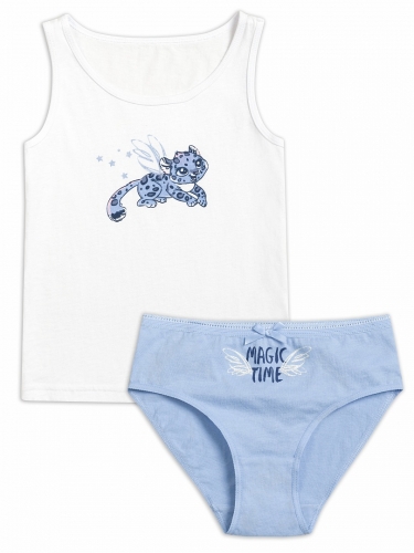 Комплект для девочек: майка и трусики. Принт с блеском. Майка на широких лямках. Трусики-слипы, декор в виде атласного бантика, по талии эластик с фестонным краем, по ноге обработка эластиком.