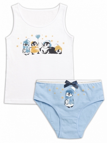 Комплект для девочек майка на широких лямках и трусики слипы с декором в виде атласного бантика и эластиком по талии с золотым люрексом. Мягкий эластичный принт с разноцветным глиттером.