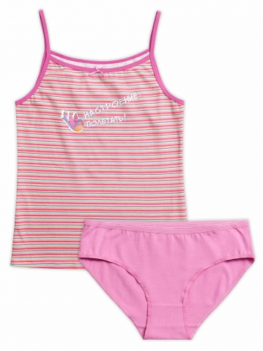 Комплект для девочек майка и трусики. Майка для девочек на тонких бретелях. Горловина декорирована атласным бантиком. Трусики слипы. По талии эластик с фестонным краем. Обработка эластиком по ноге. верх: 100%хлопок, низ: 93%хлопок 7%эластан