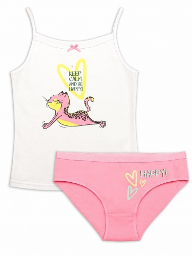 Комплект для девочек майка и трусики. Майка на тонких бретелях, отделка горловины, пройм и сами бретели из пайпинга. Декор атласным бантиком. Прочный принт. Перевод Сохраняй спокойствие и будь счастливым. Трусики слипы. По талии эластик с сатиновым блеском, обработка эластиком по ноге. Прочный принт. Перевод Счастье.