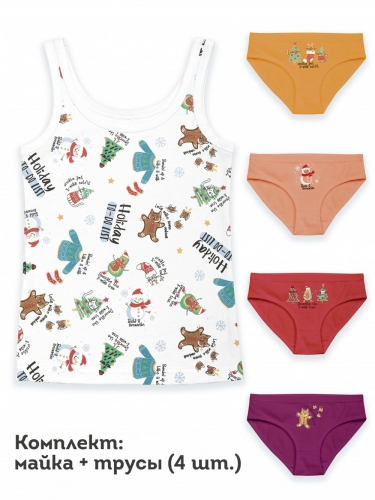 Детский комплект белья для девочки из хлопка с новогодним принтом. В набор входит бельевая майка на широких лямках и трусы слипы 4 штуки. Подарите ребенку праздничное настроение и хорошее начало дня. Новогодняя коллекция, яркий цветной набор с принтом с надписями, идеально подойдет для подарка ребенку. Пошив высокого качества, аккуратные швы, которые не доставят дискомфорт для ребенка. Трусики и майка идеально впишутся в гардероб девочки как базовое детское нижнее белье. Удобная и практичная модель майки для детей подходит для повседневной носки дома, как одежда для сна, для занятия спортом, для занятия спортом, а еще в нем весело готовиться и встречать новый год. Трикотажные детские трусики слипы для подростка с эластичной резинкой по талии надежно держатся на теле, не скручиваются, не закатываются и не сползают, а дышащая ткань позволяет избежать натирания нежной кожи.