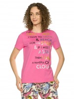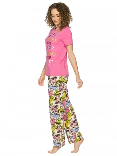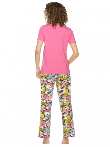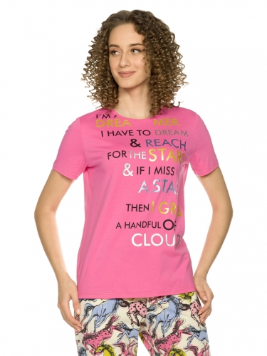 Комплект женски: футболка и брюки. Футболка прямая, небольшого объема. Шрифтовой принт с разноцветным металликом. Перевод Я мечтатель, я должен мечтать и тянуться к звездам. А если я не могу поймать звезду, я ловлю пригоршню облаков . Брюки прямые, свободные, с высокой линией талии. Мягкий стойкий all over принт динамичные и сказочные лошади.