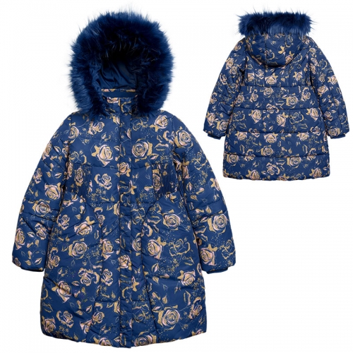 Маркированный товар! Пальто для девочек. Рекомендованный температурный режим: не ниже -15°С. Улучшенные лекала! Ткань с водоотталкивающей пропиткой, наполнитель - мягкий синтетический пух. Силуэт приталенный. Застежка на тесьму-молнию, наружная планка на кнопках. Воротник-стойка с хлопковым рибом с внутренней стороны, капюшон не отстегивается, меховая опушка отстегивается (на замке). Внутренние ветрозащитные манжеты рукавов - из риба.
