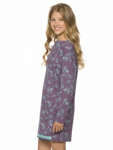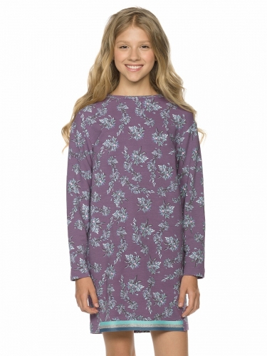 Маркированный товар Платье для девочек из футера с начёсом. Новинка! Свободный объём, О-образный силуэт, спущенная линия плеча, боковые швы переведены на перед, по низу центральной части изделия эластичная трикотажная тесьма с люрексом.