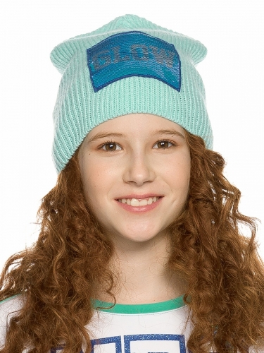 Шапка для девочек. Новая форма. Верхняя часть оформлена в виде треугольника. Однослойная вязаная шапка из акрила. По переду нашивка из переливающихся переворачивающихся пайеток с надписью, перевод Блеск .
