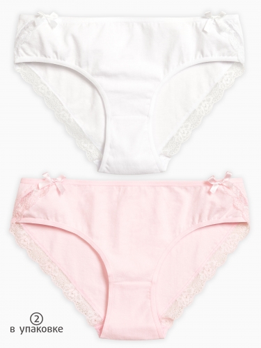 Трусики-слипы для девочек. Комплект из 2-х трусиков. На передней части изделия декоративные атласные бантики, на задней части изделия по краю - кружевной эластик.