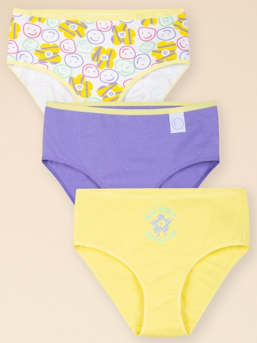 Вы в поисках качественного и комфортного белья для своего ребёнка? Тогда комплект (3 шт.) слипов высокой посадки для девочки — ваш идеальный выбор. В составе ткани преобладает хлопок — трусы мягкие, прекрасно пропускают воздух, давая коже ребёнка дышать. Эластан помогает изделию сохранять отличную форму в течение долгого времени. Благодаря качественному материалу и правильному крою модель идеально садится по телу — ребёнку удобно и днём, и ночью. Мягкая резинка не давит и не натирает. В комплект входят белые слипы, украшенные позитивным принтом в стиле граффити. Лаконичные сиреневые с изображением смайлика на декоративном вшивном ярлыке с контрастной жёлтой резинкой - изюминка модели. И трусики актуального нежно желтого цвета — их жизнерадостный цвет дополняет забавный принт с вдохновляющим текстом. Перевод принта: "Больше досуга, меньше давления". Все принты мягкие и долговечные, не боятся частых стирок. Слипы подходят как для повседневной носки, так и для занятий спортом. Оптимальный выбор для вашего ребёнка! Станет замечательным подарком, который способен вызвать искреннюю радость у каждого ребёнка, оставив незабываемые воспоминания о любом празднике и принося массу удовольствия каждый день. низ: 93%хлопок 7%эластан, низ2: 93%хлопок 7%эластан, низ:3 93%хлопок 7%эластан