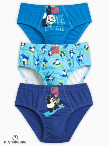Трусы-слипы для мальчиков. Набор из 3-х трусов. Цвета: лазурный, бирюзовый, синий. Центральный принт с изображением панды-сноубордиста.