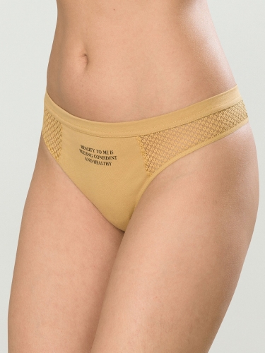 Женские трусы-стринги с низкой посадкой с тканой резинкой, в составе хлопок и эластан для практичности. Эластичная сетка по бокам – тренд на прозрачность. Прекрасный вариант дышащего нижнего белья на каждый день, для фитнеса и путешествий. Лаконичный текстовый принт придает модели спортивный вид, перевод – Для меня красота – это чувствовать себя уверенной и здоровой. Идеально сочетается с базовым топом Pelican. 93%хлопок 7%эластан, вставка: 88%полиамид 12%эластан