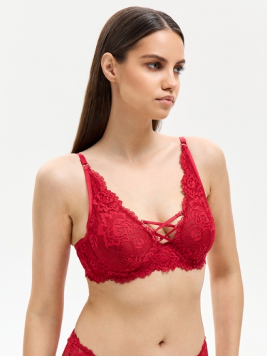 Бюстгальтер модели Soft bra with wire с мягкими чашками, на каркасах, с боковыми корсетными вставками, выполнен из нежного кружева вишневого цвета с дубляжом из сетки. Переднюю часть лифа украшают стрепы с колечками в цвет изделия. Широкие кружевные бретели в передней части лифа переходят в регулируемые бретели на спинке. Ширина бретелей во всех размерах 10 мм.Застежка на 2 крючка и 3 ряда петель. Размерная сетка 70A, 70B, 70C, 75A, 75B, 75C, 75D, 80B, 80C, 80D, 85B, 85C