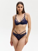 Бюстгальтер модели Soft bra with wire с мягкими чашками, на каркасах, с боковой поддержкой из поролона, с боковыми корсетными вставками, выполнен из нежного кружева и сетки глубокого синего цвета. Переднюю часть лифа украшают стрепы, переходящие в регулируемые бретели, кольца, бантик и серебряная повеска-кисточка.Застежка на 2 крючка и 3 ряда петель. Ширина бретелей на объемы 70, 75 и 80 см с чашками А,В,С - 10мм, на объемы 75, 80 и 85 с чашками D и E и размер 85С - 12 мм. Размерная сетка 70A, 70B, 70C, 75A, 75B, 75C, 75D, 80B, 80C, 80D, 85B, 85C.