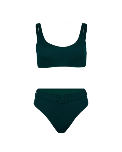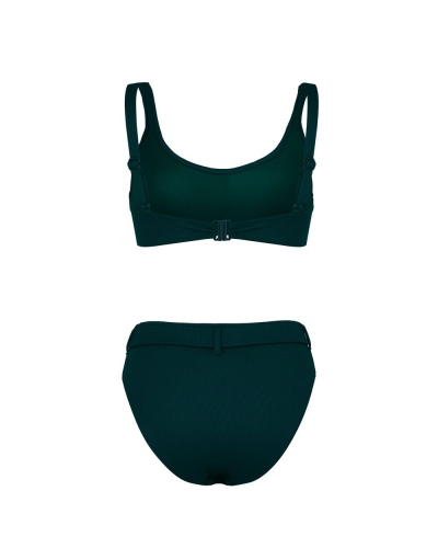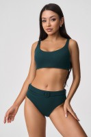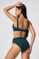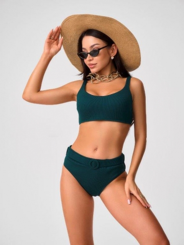 Раздельный купальник с формованнй чашкой soft bra из фактурного полотна. Бюстгальтер с мягкой чашкой из тонкого формованного поролона. Без каркасов, с боковыми корсетными вставками. Бретели широкие, несъемные,регулируемые. Пластиковая застежка. Плавки на подкладе с завышенной линией талии. Эластичный пояс по линии талии с декоративной пряжкой из ткани купальника. Тонкая резинка, подгиб и плоский шов по талии и срезу ножек.